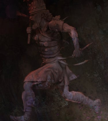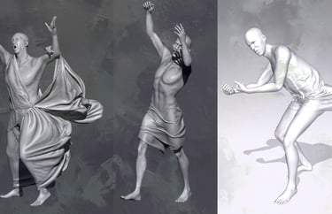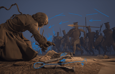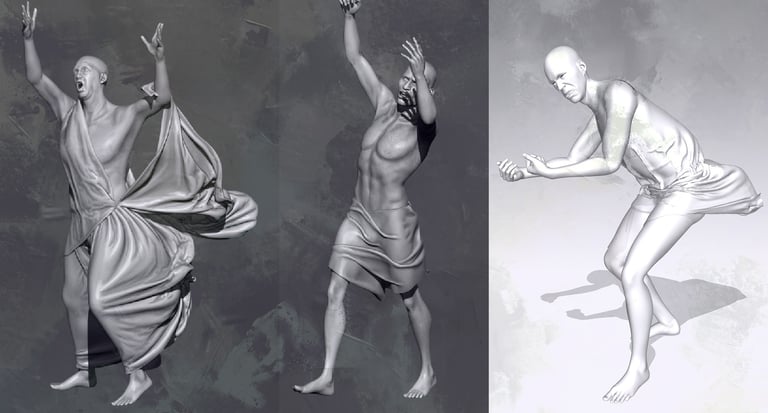 Here's an example of a 3D mesh that I have applied my "clay sculpture style" to. It's rough, in nature, but like a real-world stone sculpture, the mesh presents better emotion and immersion from the viewer. These types of models, and the light/shadow volumes they create, are where I start alot of my paintings from. The enemy running shot, is a test render from Unreal Engine. It helps me to great shadows and forms. The last image is a test painting from one of the UE renders.