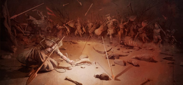 image 04 - closeup of damaged jawbone, piles of bodies. Samson leans on overturned chariot, looking up exhausted and crying out to God.