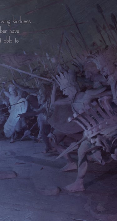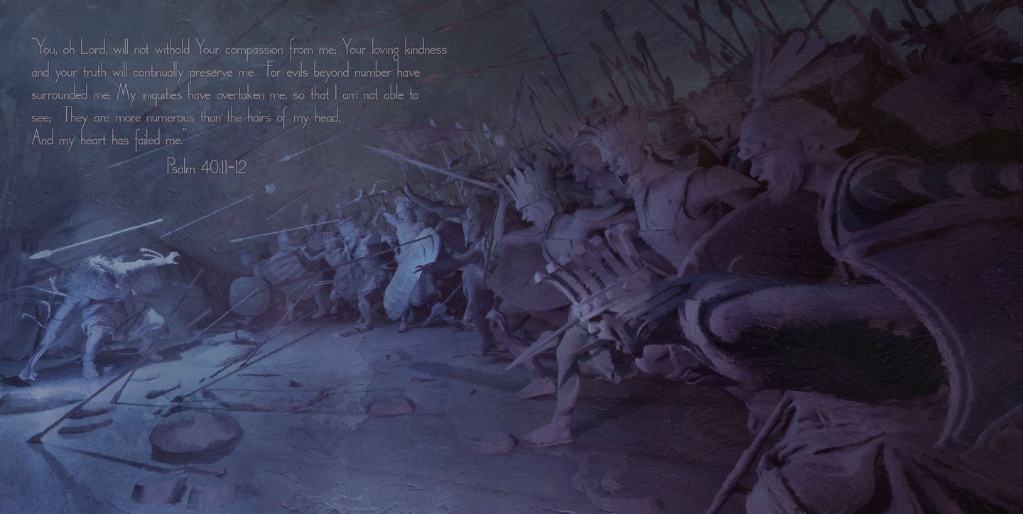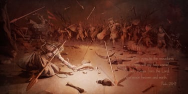 I did my best to show the completely "Unwinnable" predicament, Samson was caught up in. Suggested by a military friend, I filled the air with projectiles, a "Rolling Barrage," prior to the main charge. The scriptures say the Philistines "Came shouting against him." In their triumph and bloodlust, I imagine the orders were to grind him to dust. But Samson was NOT alone.